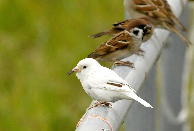 体の色違っても仲間外れにしない 幸せの白いスズメ 鹿児島・志布志で見つかる市内の田んぼで白いスズメを見つけた。普通のスズメと仲良く群れていたといい、「温かい気持ちになった」と目を細めながら振り返る。 7月26、28日、別の鳥の撮影に出掛けた帰りにたまたま発見した。頭部に少し茶色が残っている。県立博物館によると、突然変異のアルビノではなく、何らかの理由で色素が抜けた白化個体(白変種)と考えられる。同館にも過去、数例の報告があるという。 古くから、「白いスズメは縁起がいい」ともいわれる。