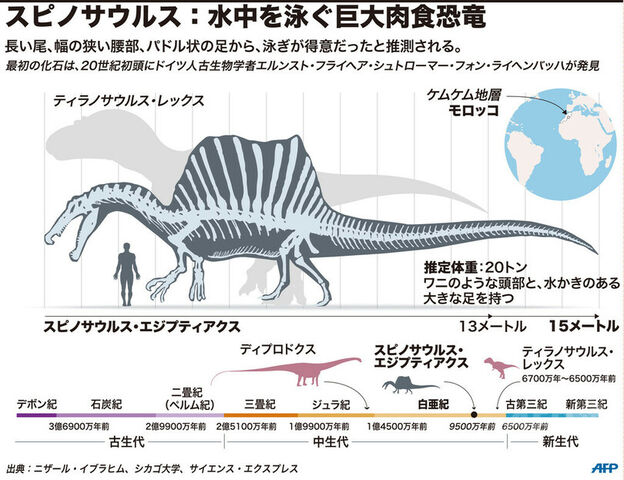 | スピノサウルスの骨はペンギンのようだった、水中で狩りをしていた説が強まる証拠 …時間を水中で過ごし、水中の獲物を狩っていた可能性を示唆している。 「スピノサウルスは、浅瀬を歩くこともあったかもしれませんが、生態としては水中生活を送… (出典:ナショナル ジオグラフィック日本版) |