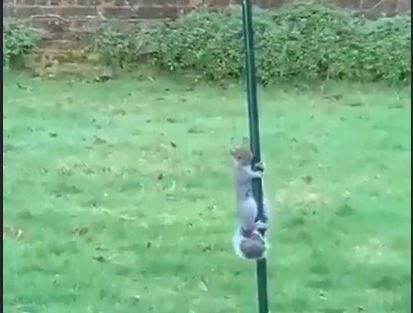 小鳥のエサを狙うリス。なぜ登れないのか不明顔!