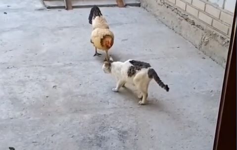 ニワトリの気迫がネコを尻込みさせてしまう