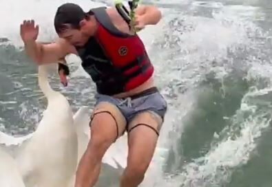 水上スキー中に白鳥に襲われる