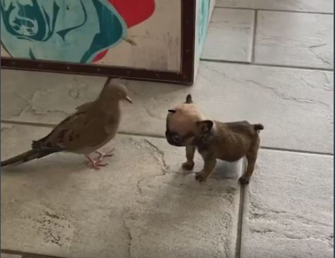 仲良し!?子犬にハトがおんぶ(´∀`