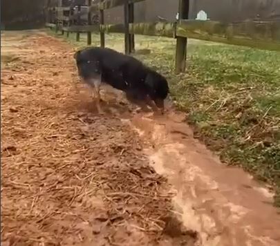 水の流れに魅了されたワンちゃん